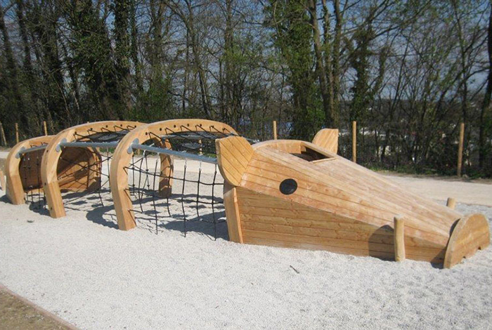 Beim Spielgerät selber war es uns wichtig, Klettermöglichkeiten und Räume zu schaffen, die die Kinder einladen, das Wildschwein auf möglichst vielfältige Art und Weise zu bespielen, z. B. seitlich hochklettern, darüber gehen, queren, verstecken, durchlaufen. Die Rippen bilden dabei die tragende Struktur, ansonsten wurde das Wildschein so durchlässig wie möglich gestaltet, um eine größtmögliche Transparenz und damit den Durchblick in den Garten zu gewährleisten.