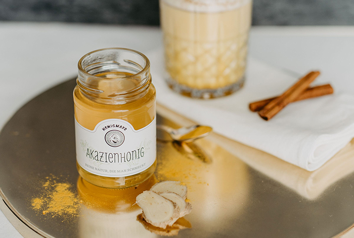 - Zur Abrundung des Geschmacks folgt noch ein Esslöffel Akazienhonig von Honigmayr. Als vegane Alternative zum Honig kann auch der Bio-Agavensirup von Honigmayr beigefügt werden. Nun einmal gut umrühren und genießen.