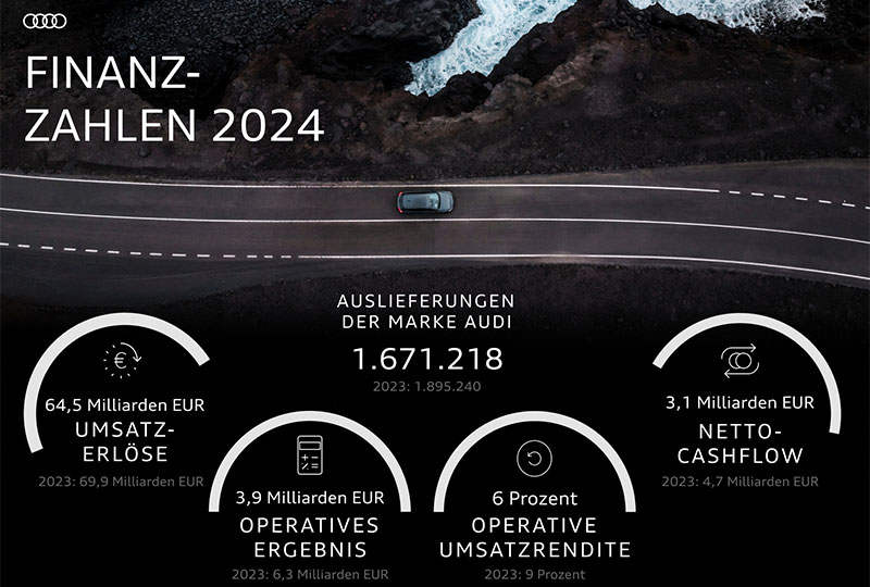 Der Audi Konzern hat das Geschäftsjahr 2024 in einem herausfordernden Marktumfeld robust abgeschlossen. In den abgelaufenen zwölf Monaten summierten sich die Umsatzerlöse auf 64,5 Milliarden Euro, das Operative Ergebnis belief sich auf 3,9 Milliarden Euro, die Operative Umsatzrendite lag bei 6 Prozent. Der Netto-Cashflow erreichte 3,1 Milliarden Euro. Für 2025 gilt weiter: Audi liefert. Modell für Modell. Bis Ende des Jahres wird das Unternehmen das jüngste Produktportfolio im Wettbewerbsumfeld haben.