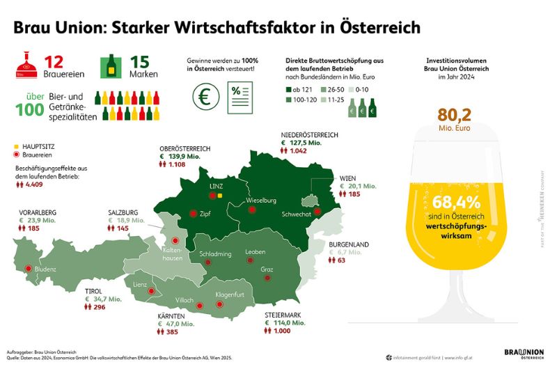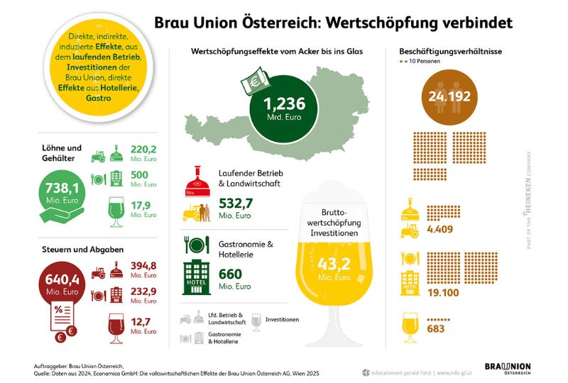 „Die Brau Union Österreich erzielte im Jahr 2024 eine totale Bruttowertschöpfung von 532,7 Millionen Euro in Österreich“, erklärte Univ.-Prof. Dr. Christian Helmenstein, Geschäftsführer der Economica GmbH, welche die Studie durchführte. „Berechnet man die gesamte durch das Unternehmen ausgelöste Wertschöpfung, so beträgt dieser Wert sogar 1,236 Milliarden Euro.“ Damit hat das Bier einen größeren Effekt auf die heimische Wirtschaft als etwa die gesamte österreichische Textilproduktion.