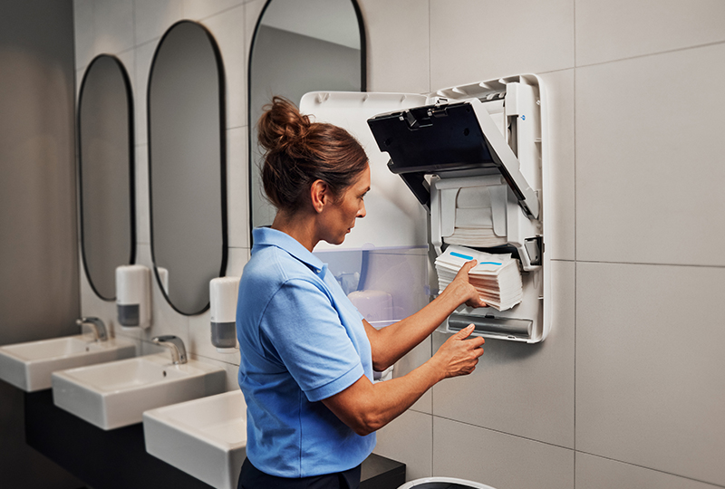 Dank 50 Prozent komprimierter Nachfüllbündel lassen sich doppelt so viele Handtücher einlegen – ein entscheidender Vorteil zu Stoßzeiten.