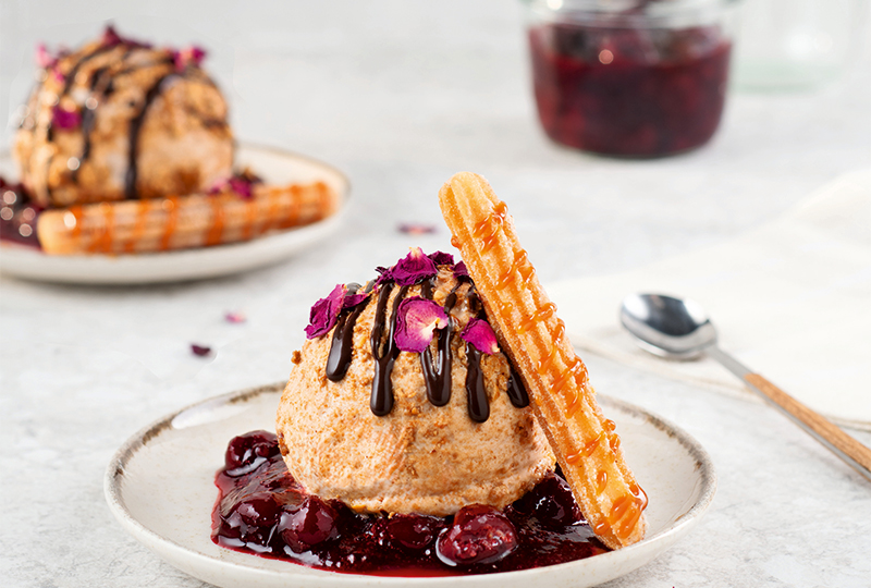 Haselnussparfait mit balsamischen Kirschen und Karamell-Churros