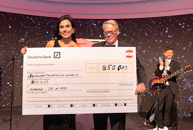 Einer der emotionalsten Momente des Abends: die große Scheckübergabe zugunsten der weltweiten Projekte von „Brot gegen Not“. Die großzügigen Spenden von exakt 350.013 € fließen insbesondere in das aktuelle Großprojekt im Senegal, wo in wenigen Wochen eine Ausbildungsbäckerei eröffnet wird, die sowohl Arbeitsplätze schafft als auch Schulkindern täglich eine warme Mahlzeit sichern soll.