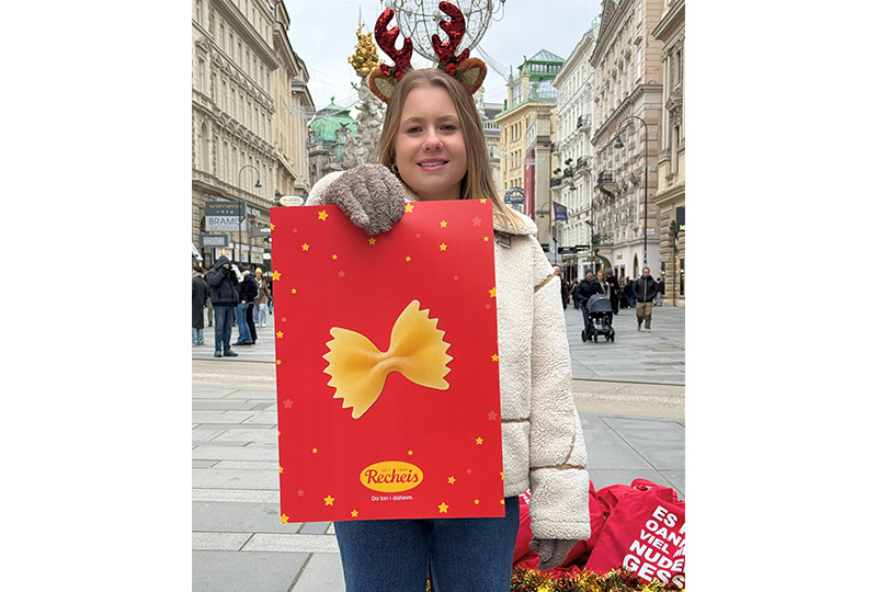 Nudeliges Weihnachtsrätsel Beim Recheis Weihnachtsrätsel von 01.12. bis 29.12.2025 – auf der Website von Recheis – kann jede/r Mitspielerin durch das Erraten der richtigen österreichischen Nudelformen Gutes tun und das Spendenvolumen vergrößern. Recheis spendet für jedes Mal Spielen eine Portion Nudeln an die Team Österreich Tafel. Damit diese weihnachtliche Spendenaktion möglichst viel Aufmerksamkeit erhält, hat Lea von Recheis bei einer Straßenumfrage das Nudelwissen der Wienerinnen getestet und sie zu verschiedenen Nudelformen befragt. Die entstandenen Kurzvideos werden als Werbemittel für die dazugehörige Social-Media-Kampagne ausgespielt.