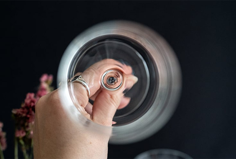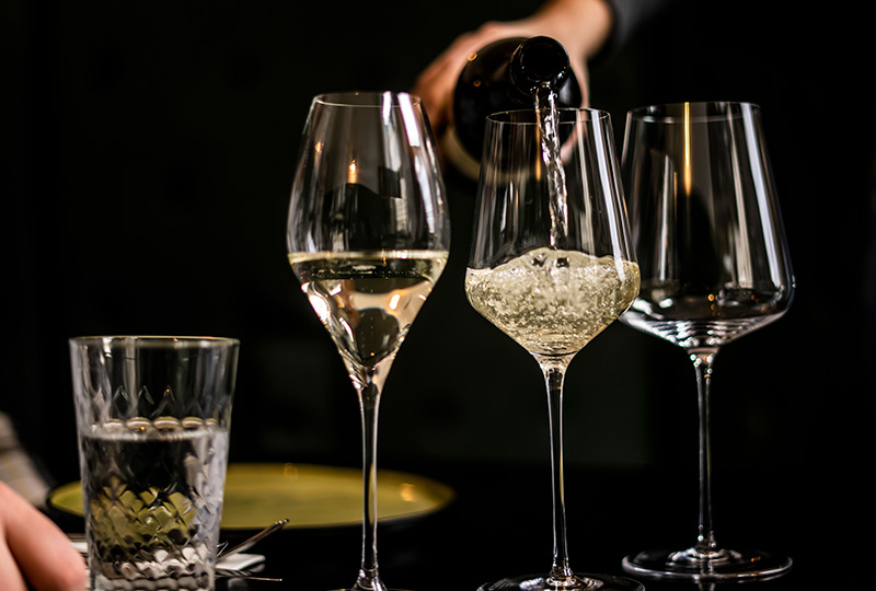 Wertschätzend gesagt sind sie schön anzuschauen, sonst aber schwierig. Geschliffene Kanten verändern die Strömung Richtung Mund. Mikrokratzer versetzen die Perlage von Schaumweinen in Chaos. Es scheint sich um Kleinigkeiten zu handeln – aber genau die entscheiden, ob ein Wein brilliert oder einfach „eh okay“ schmeckt. Das beste Glas der Wahl ist geblasen – so sind die Ränder gleitfähig und spülen einem die Sinnesfreuden ohne „Strömungswiderstand“ um die Geschmacksknospen und lassen Feinheiten auch olfaktorisch glänzen. Wenn es um Sprudel geht, gibt es nur eine akzeptable raue Stelle: den so genannten Moussierpunkt – eine kleine, als Punkt hervorstehende Stelle am Boden eines Schaumweinglases. Er dient dazu, die Bildung von Bläschen zu fördern. Vom Moussierpunkt aus steigen die Bläschen in einer gezielten Perlungskette nach oben. Das wertet Sprudel optisch auf und unterstützt die Freisetzung der Aromen.
