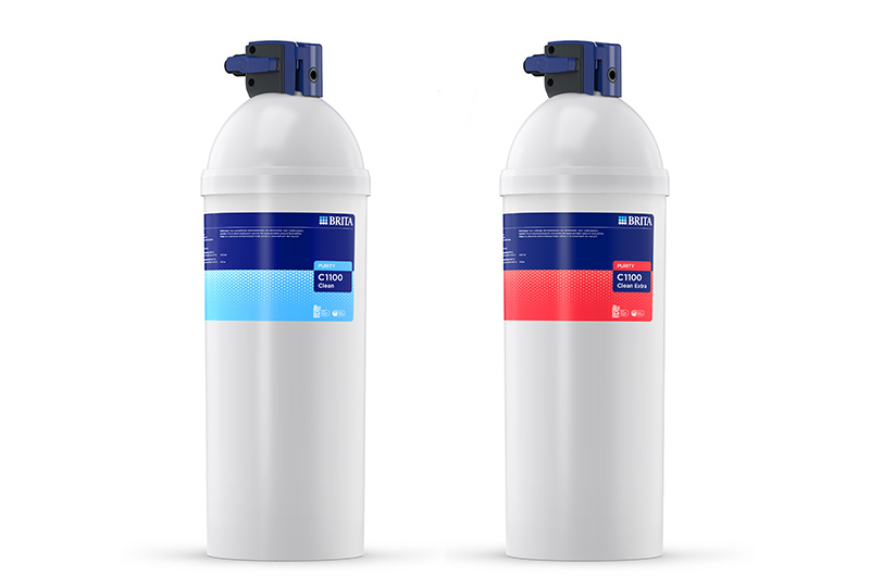 Speziell für Untertisch-Spülmaschinen: Die BRITA Professional Filter PURITY C Clean (oben) und PURITY C Clean Extra (unten) beugen Ablagerungen durch Mineralien wie Kalk und Gips effektiv vor. © BRITA