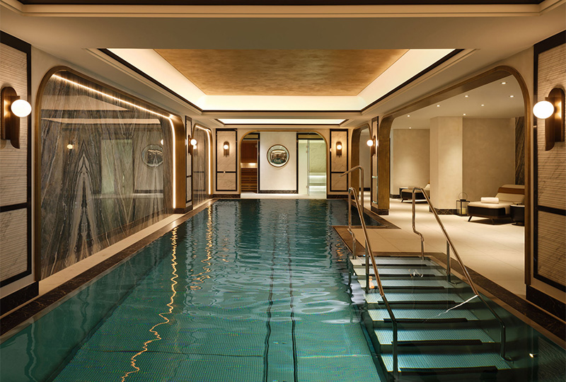 In seiner Gestaltung folgt der Spa-Bereich dem Prinzip der eleganten Reduktion. Eine Entspannungslounge, sieben Behandlungsräume, davon eine Couple-Suite sowie ein 13 Meter langer Innenpool laden zum Relaxen ein. Goldfarbene Akzente im Poolbereich greifen die edlen Jugendstil-Elemente des Hauses auf, während Materialien von natürlicher Wärme, gedämpftes Licht und klare Linien eine Atmosphäre schaffen, die Ruhe und Hinwendung auf das Wesentliche ermöglicht.