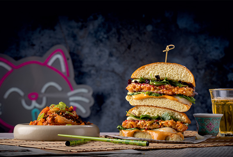 Kimchi hat längst den Sprung aus der traditionellen Küche in die globale Gastronomie geschafft. Der Crunchy Kimchi Burger greift diesen Trend auf und kombiniert Kimchi, Fried Rice mit einer knusprigen, roten Panade. Das sorgt für Biss, Farbe und einen auffälligen Social-Media-Look.