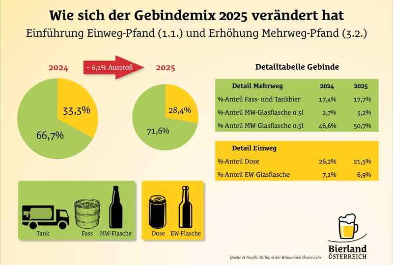 Das mengenmäßige Minus beim Inlands-Gesamtausstoß Bier inkl. AF-Bier beträgt 510.677 Hektoliter[5] – das entspricht „mehr oder weniger 1:1 jener Menge, die beim Dosen-Absatz fehlt.“[6] Die Brauer gehen davon aus, dass sich auch die Dosenbierabsätze wieder erholen, sobald sich das Einwegpfand-System vollständig etabliert hat und von Konsumentinnen und Konsumenten akzeptiert wurde. Bis Ende 2025 konnten vom Handel noch Dosen-Restbestände ohne Pfand abverkauft werden. Langfristig wird sich der Markt stabilisieren – zumal jedes Gebinde seine Berechtigung und spezifische Einsatzbereiche hat. „Wir gehen nicht davon aus, dass sich die Dose als Gebinde für Bier marginalisieren wird. Gerade bei Events oder überall dort, wo Bruchsicherheit entscheidend ist, bleibt sie relevant“, betont Florian Berger, Geschäftsführer des Brauereiverbandes. „Uns als Branche ist es wichtig, für jeden Genussanlass weiterhin das passende Gebinde anbieten zu können“, so Berger.