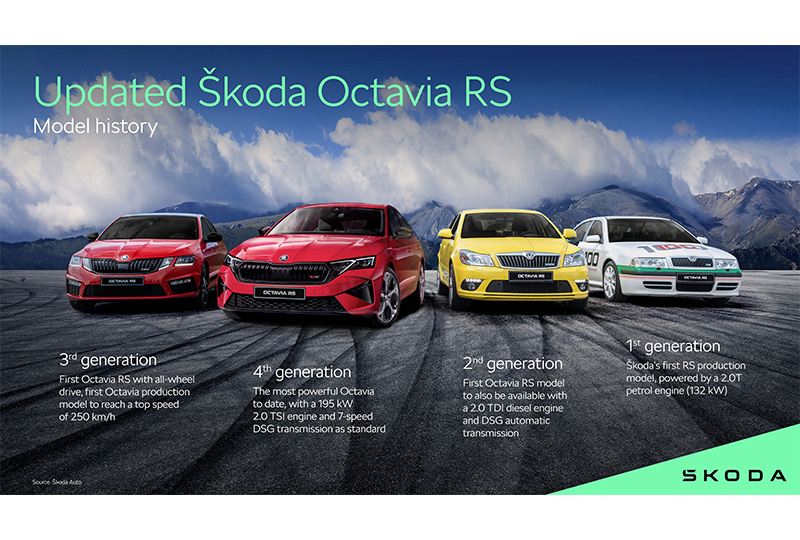 Die Aufwertung der vierten Octavia-Generation der Neuzeit im Jahr 2024 umfasste unter anderem neu gestaltete vordere und hintere Stoßfänger sowie den modifizierten Škoda Grill. Ebenfalls neu sind die Matrix-LED-Scheinwerfer der zweiten Generation, überarbeitete LED-Heckleuchten mit animierten Blinkern sowie neu kreierte Leichtmetallfelgen. Die neue Angebotsstruktur besteht fortan aus den vier Ausstattungslinien Essence, Selection, Sportline und RS sowie neun Design Selections für den Innenraum. Die Motorenpalette umfasst 1,5 TSI-Benziner – jeder davon auch mit Mild-Hybridtechnologie – sowie leistungsstarke 2,0 TSI-Benzinaggregate und 2,0 TDI-Turbodiesel. Die Leistungsspanne erstreckt sich von 85 kW (115 PS) bis 195 kW (265 PS). Darüber hinaus erweitert Škoda Auto ein weiteres Mal das reichhaltige Angebot an aktiven und passiven Sicherheitsausstattungen. Der neue Aufmerksamkeits- und Müdigkeitsassistent erfasst das Verhalten des Fahrers durch vielfältige Daten und Parameter. Insgesamt schützen bis zu zehn Airbags die Insassen des aufgewerteten Octavia. Leistungsstärkstes Modell der Octavia-Familie ist der RS, der als Limousine und Kombi erhältlich ist. Der Topbenziner mit 2,0 Liter Hubraum treibt Octavia RS mit 195 kW (265 PS) an. Ein elektromechanisches Differenzial verbindet Top-Fahrleistungen mit Agilität und Komfort.