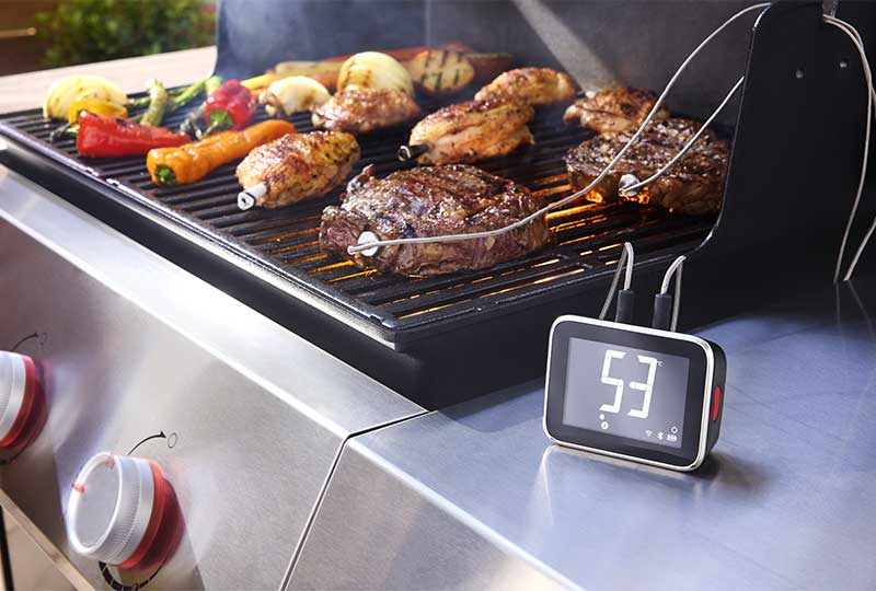 Smarte Grillthermometer: Neue kabellose Temperaturfühler überwachen Kerntemperatur und Garzeit direkt am Grill oder per App. Ein Smart Hub verbindet mehrere Thermometer gleichzeitig.