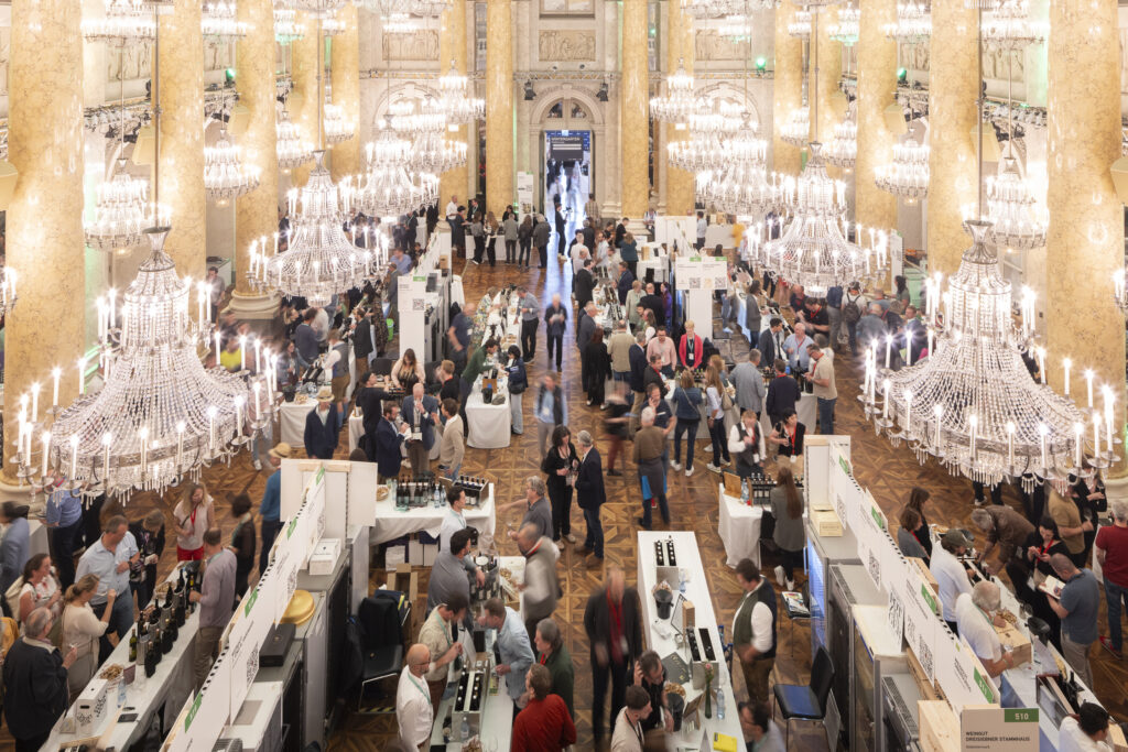 präsentieren. Gleich weiter in der Antekammer sind Weingüter aus Portugal, Frankreich, Moldawien, Griechenland (dem Gastland 2024) und aus dem Portfolio des Weinhandelshauses Derksen versammelt. Setzt man die Tour geradewegs fort, führt der Weg in den Marmorsaal mit Aussteller:innen aus Deutschland und Italien. Wer die Zone Zero „für mehr Mut“ zu alkoholfreien Alternativen mit ihrem Programm an Podiumsdiskussionen sucht, findet diese einen Saal weiter in der Geheimen Ratstube.